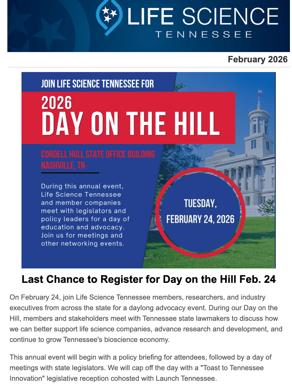 Life Science Tennessee is a statewide, non-profit, member organization of more than 110 companies whose mission is to advance and grow the life science industry in Tennessee through advocacy, partnerships and alignment with economic and workforce development.